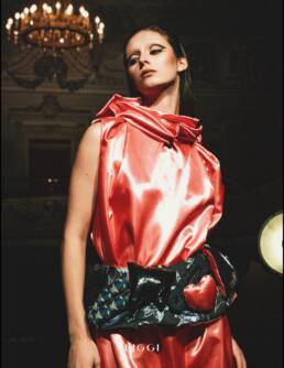 In the heart of the Bibiena Theater in Sant’Agata Bolognese, an atmosphere of times gone by intertwines with contemporary elegance, giving life to images that celebrate the magic of the 1950s divas and the art steeped in mystery of Pirandello’s masks. The enchanted creatures of that period, velvety dresses and sparkling accessories, take shape in a context that speaks of duality, of a beauty hidden behind appearances.Pirandello’s masks, symbols of elusive identity and mystery, present themselves as a perfect parallel to the complexity of clothes. Each garment is a declaration of intent: fine fabrics and bold cuts are accompanied by extraordinary volumes, transforming the models into authentic muses, as if they had crossed time to relive their golden era.