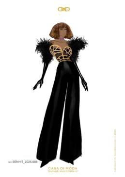 Il Monte Titano, i Titani ancor prima degli Dei, Senhit come una dea che si forgia dalla terra. Un look completamente nero, per enfatizzare la bellezza, la professionalità e il talento dell’artista, con spalle decorate da marabù in organza, a simboleggiare le fiamme del fuoco del centro della Terra. La sensualità delle forme avvolge l’intera silhouette, completata dal “corsetto gioiello” rivestito in foglia d’oro, come la forgiatura di un prezioso, arricchito da cristalli di ametista dalle profondità del luogo che ci accoglie, tra realtà e leggenda.